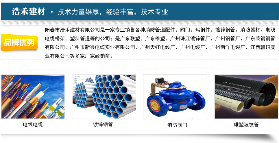 陽春市浩禾建材有限公司是一家專業銷售各種消防管道配件、閥門、瑪鋼件、鍍鋅鋼管、消防器材、電線電纜橋架、塑料管道等的公司;是廣東聯塑、廣東雄塑、廣州珠江鍍鋅管廠、廣州鋼管廠、廣東榮鋼鋼管有限公司、廣州市新興電纜實業有限公司、廣州天虹電線廠、廣州電纜廠、廣州南洋電纜廠、江西贛瑪實業有限公司等多家廠家經銷商。